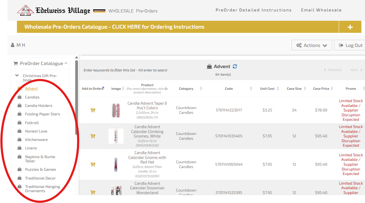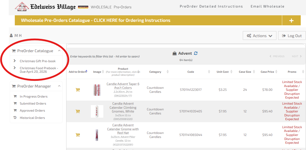 Select the catalogue you would like to pre-order from - side panel [far left side of screen]
