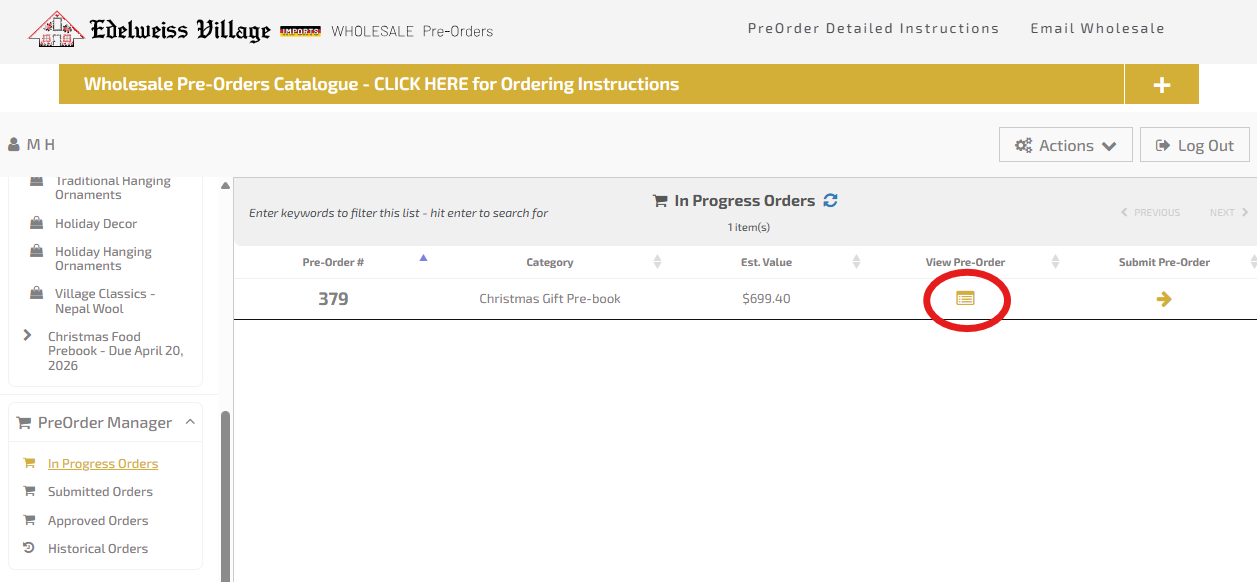 When you have completed adding items, click on the gold "Submit PreOrder" button. Your order will move to "Submitted Orders".
