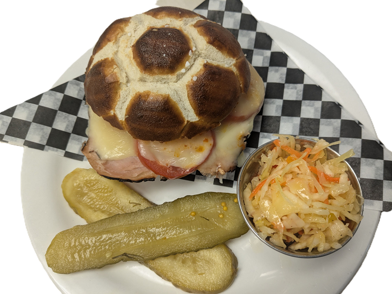 A Village pretzel filled with black forest ham, cheese, tomatoes, and roasted red pepper spread.