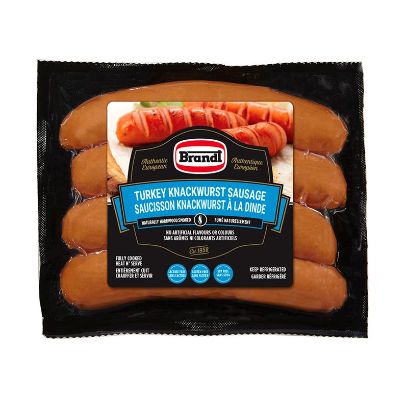 Brandt’s famous Turkey Knackwurst is crafted with select turkey, mildly spiced and naturally hardwood smoked.