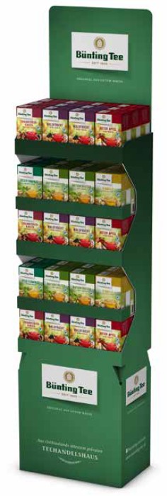 A beautiful displayer with six Buenting tea flavours: 13 x Blackcurrant-Cherry, 13 x Chamomile, 13 x Natural Herb, 14 x Peppermint, 13 x Red Apple, 14 x Forest Fruit.