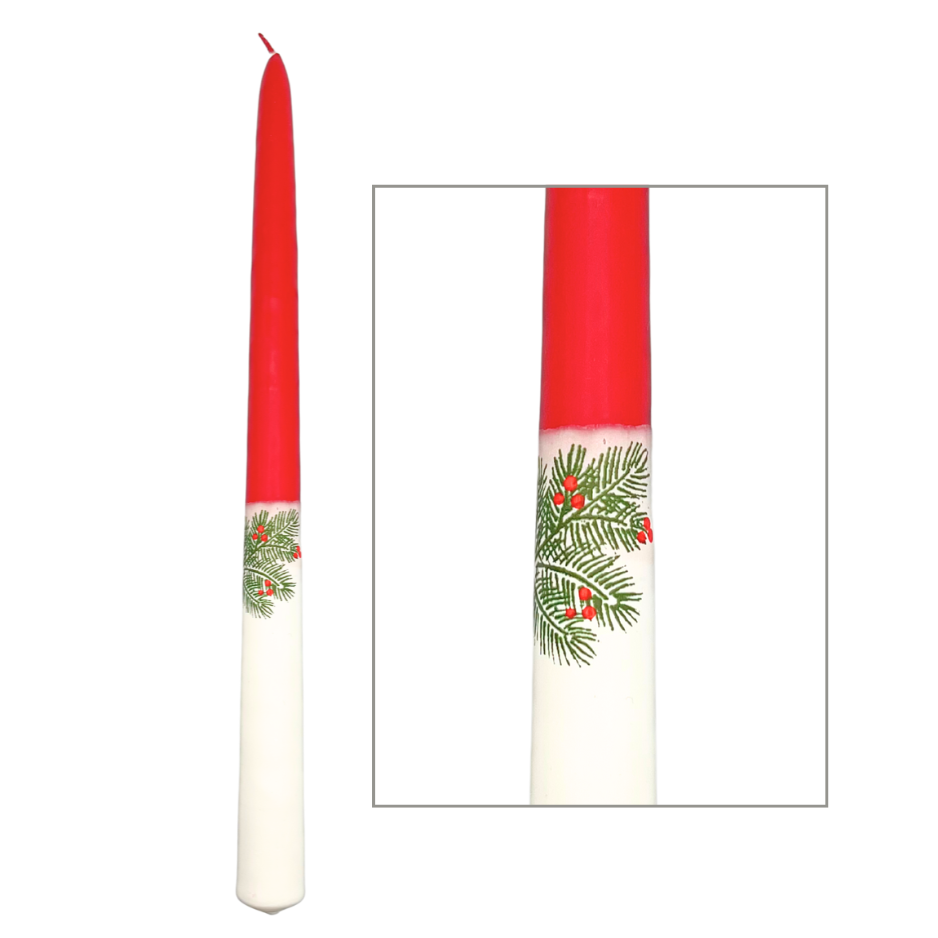 Jakelio Taper Candle Pair Red & White with Holly & Berries 30cm