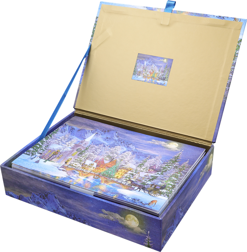 Premium card set includes 20 cards and 21 envelopes, presented in a keepsake box. Card interiors are uncoated for writing ease. Quality card stock takes pen beautifully. White stationery envelopes are self-sealing for your convenience. Keepsake box reproduces the design on the lid. A smaller image is replicated inside. Elegant box features a ribbon tab, ribbon hinge, and a magnetic closure. Perfect for storing holiday mementos, postage stamps, and more!