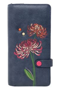 This clutch style wallet has a front snap closure with 11 built-in card slots,