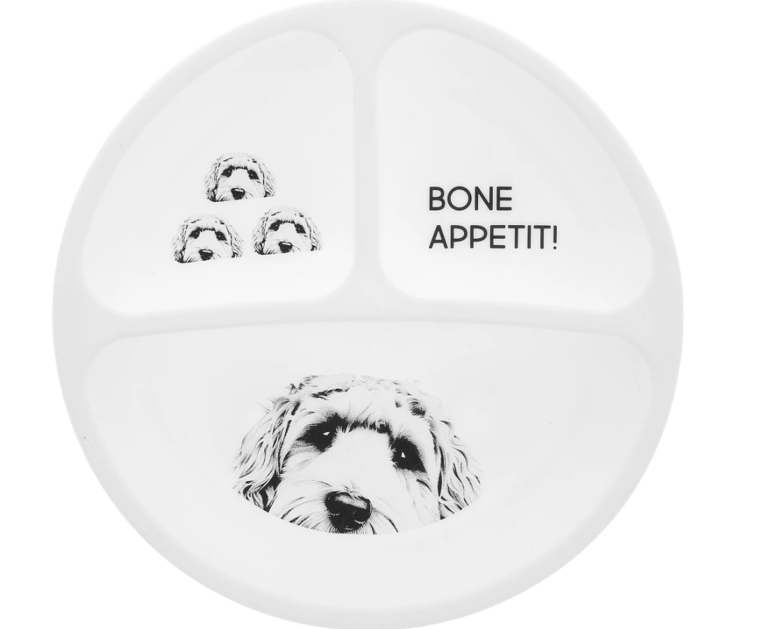 The plate features a playful design with a cute dog and the fun phrase "Bone Appétit!" The printed sticker is durable and adds a charming touch to every meal. The design encourages children to participate and fosters their love of animals.