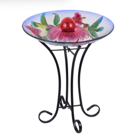 Garden Ornament, Bird bath with stand Orb Floral Glass Hummingbird, solar illuminated