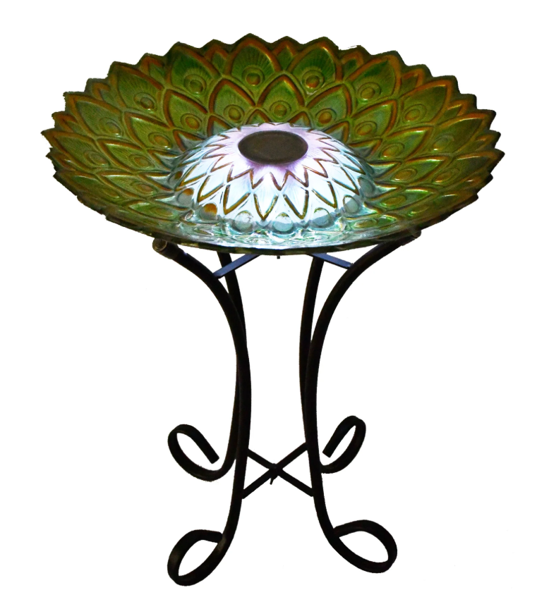 Stunningly designed with a large colourful bowl, this bird bath, featuring a peacock-inspired green geometric pattern, will attract your backyard birds for hours of viewing pleasure. A four-legged metal stand is included and the solar panel lights up in the darkness.