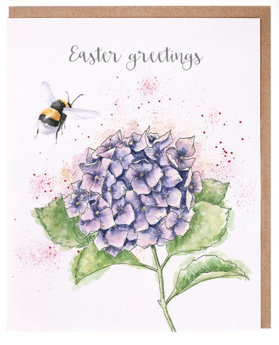 This Easter card, featuring a pretty bee and hydrangea, is perfect for Easter and bears the inscription "Easter Greetings." It is printed on high-quality, textured cardstock and comes in a recycled kraft paper envelope. The greeting inside reads: "Happy and Blessed Easter!"