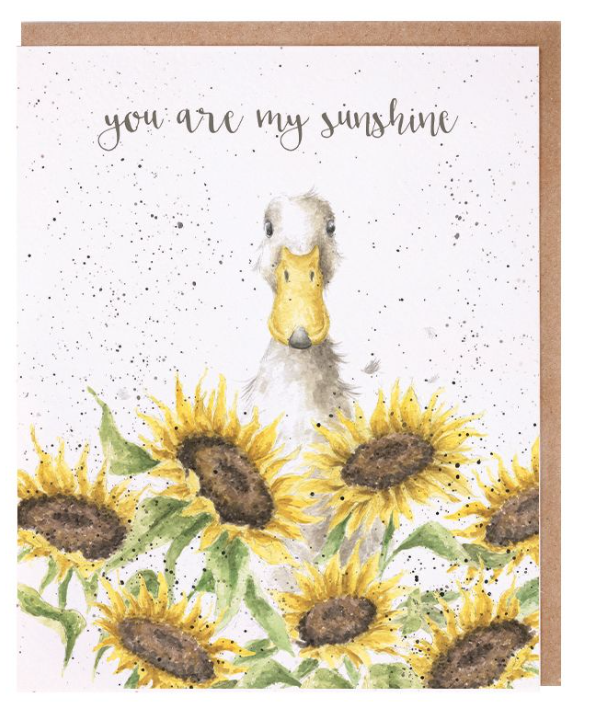 Brighten someones days with this card which features a duck amongst beautiful sunflowers and reads 'You are my sunshine' The card is printed on high quality, sustainably sourced textured board and is supplied wrapped with a recycled, kraft envelope.