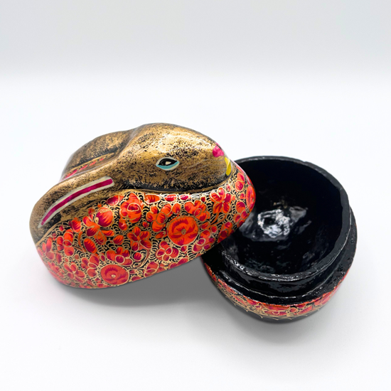 A charming 5-inch handmade bunny trinket box. An Eco-friendly home décor Gem. Perfect for storing small treasures, jewelry or keepsakes.