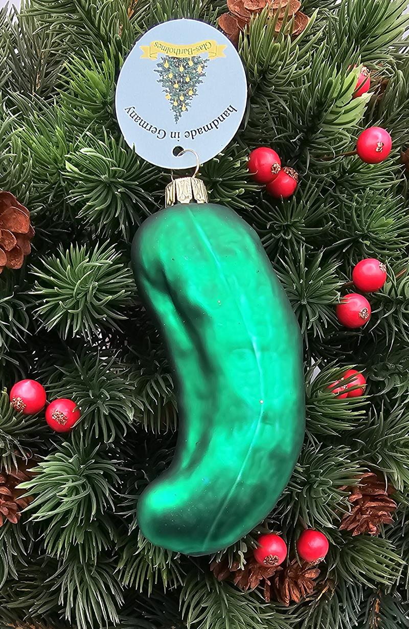 matte green - The Christmas pickle is a German-American Christmas tradition. A decoration in the shape of a pickle is hidden on a Christmas tree, with the finder receiving either a reward or good fortune for the next year.