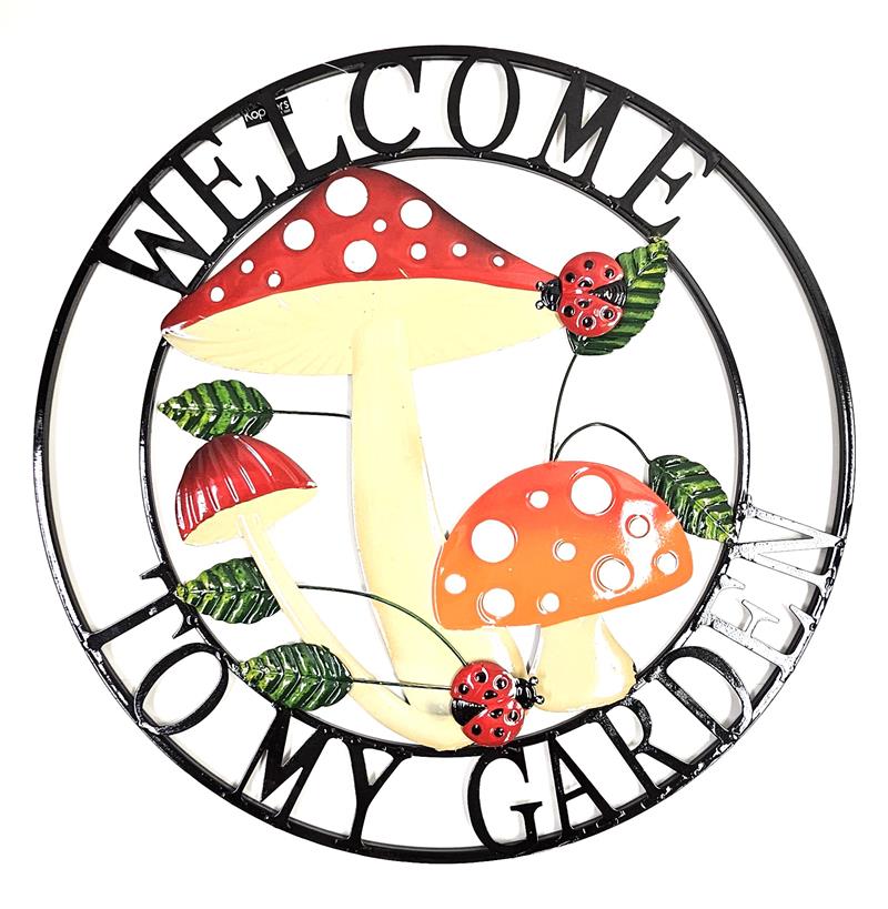 Metal Circle Wall Décor, Mushroom 'Welcome to my Garden'