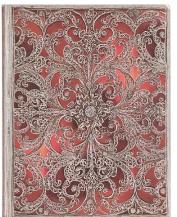 his Silver Filigree Garnet cover was originally designed in Germany in the early 1800s. To achieve the gilded motif, a base layer of silver sheets was first die cut, and elaborate grooves were then etched into the surface. Our silver and jewel-tone red design celebrates the technique of filigree, an art form that is a testament to the human drive to ornament.