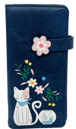 This classic vegan leather wallet features an adorable appliqué of a cat sitting among flowers in a hanging basket - a sweet, whimsical design perfect for any cat lover. Despite its compact feel, it easily fits your bills, coins, IDs, and cards, keeping everything organized in one charming accessory. Durable, functional, and cruelty-free, it’s a wallet you’ll reach for every day.