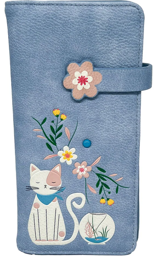This classic vegan leather wallet features an adorable appliqué of a cat sitting among flowers in a hanging basket - a sweet, whimsical design perfect for any cat lover. Despite its compact feel, it easily fits your bills, coins, IDs, and cards, keeping everything organized in one charming accessory. Durable, functional, and cruelty-free, it’s a wallet you’ll reach for every day.