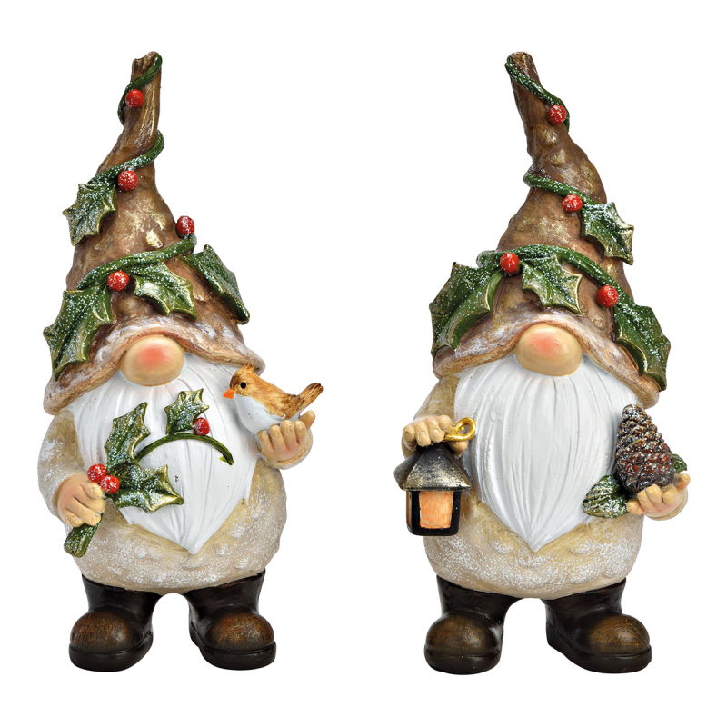 Ornament Polyresin Gnome with Holly Leaf and Bird or Pine Cone and Lantern 2 Assorted