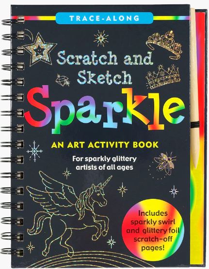 White outlines on black scratch-off pages create a fun way for younger children (5 and up) to trace favorite animals, revealing patterns, swirls, and holographic colors.