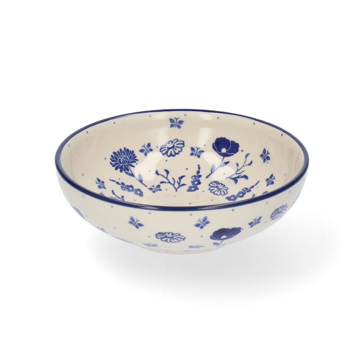 A joyful design with royal-blue butterflies flying upward through different kinds of flowers.