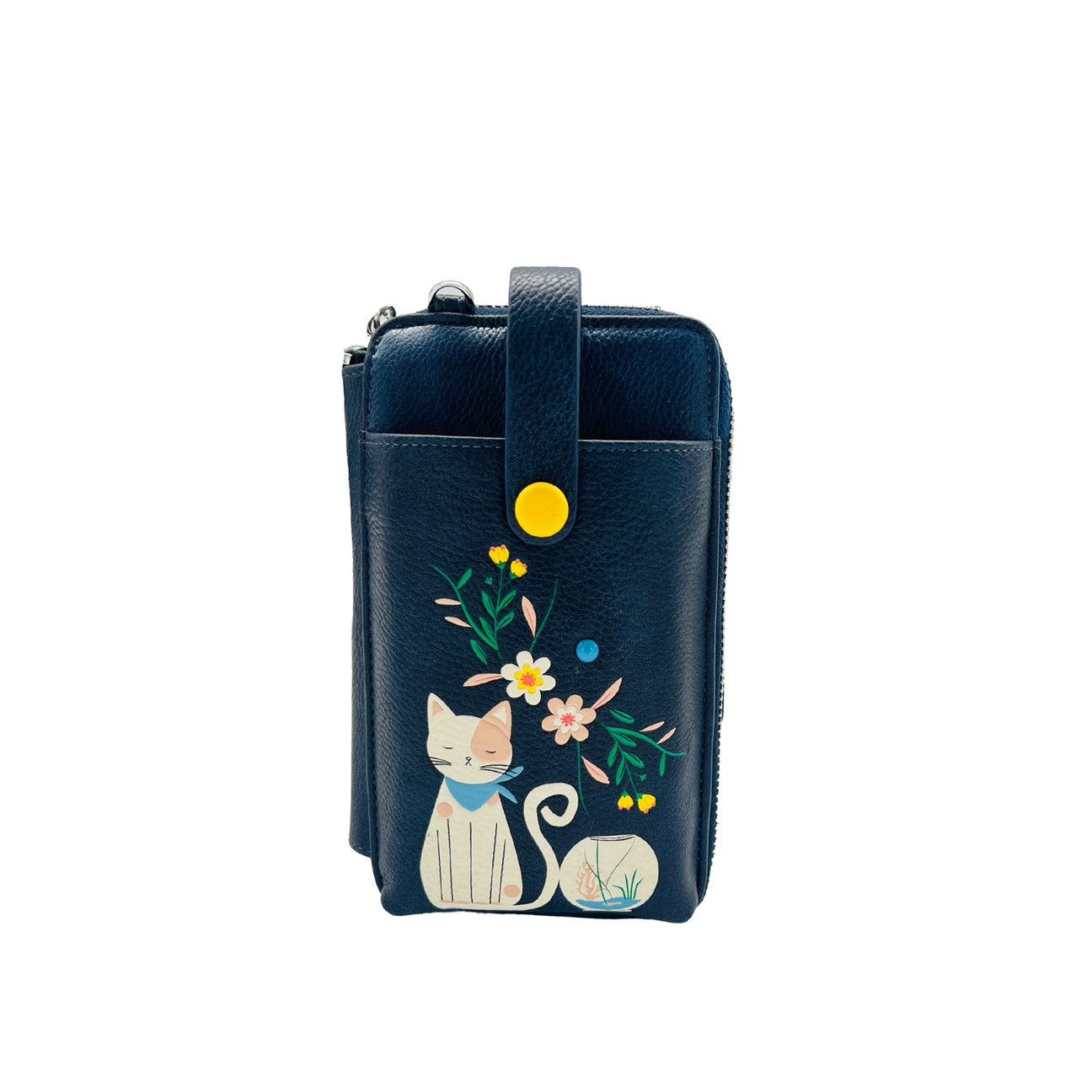 This adorable vegan leather smartphone pouch features a sweet cat sitting next to blooming flowers - a charming design that adds joy to every outing. Small but highly functional, it can be worn as a crossbody, carried as a clutch with the wrist strap, or used as a wallet inside a larger bag. Versatile, lightweight, and perfect for hands-free convenience.