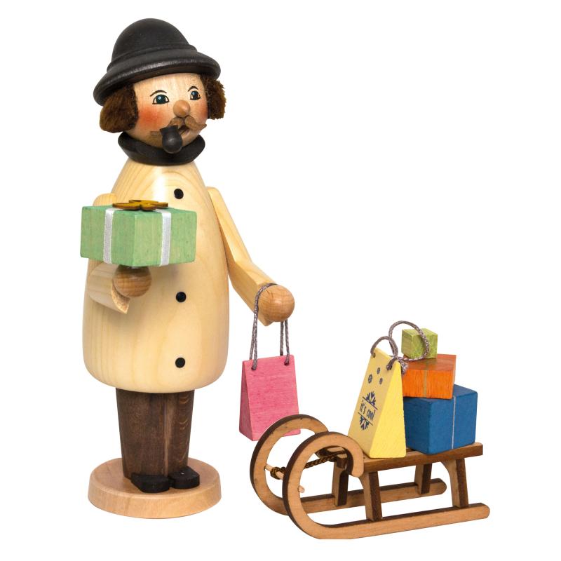 This great and elegant incense figure depicts a Christmas market shopper and has been decorated with loving details such as a sleigh with gift bags.