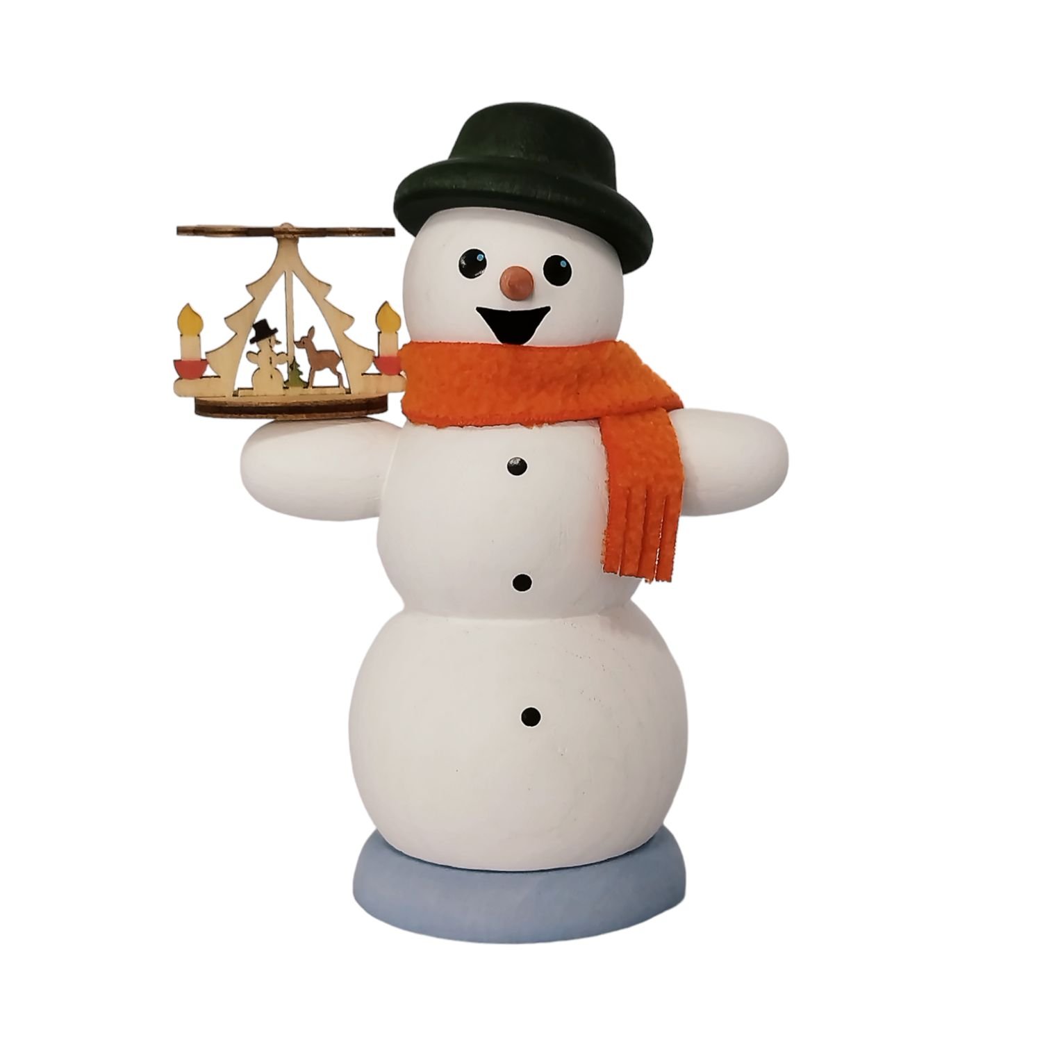 This snowman wears a fluffy scarf around his neck and a winter-patterned woolen hat on his head. With the black coal buttons on his belly and the carrot nose on his face, he exudes a cheerful winter mood. The snow-white body consists of two balls decorated with black buttons.